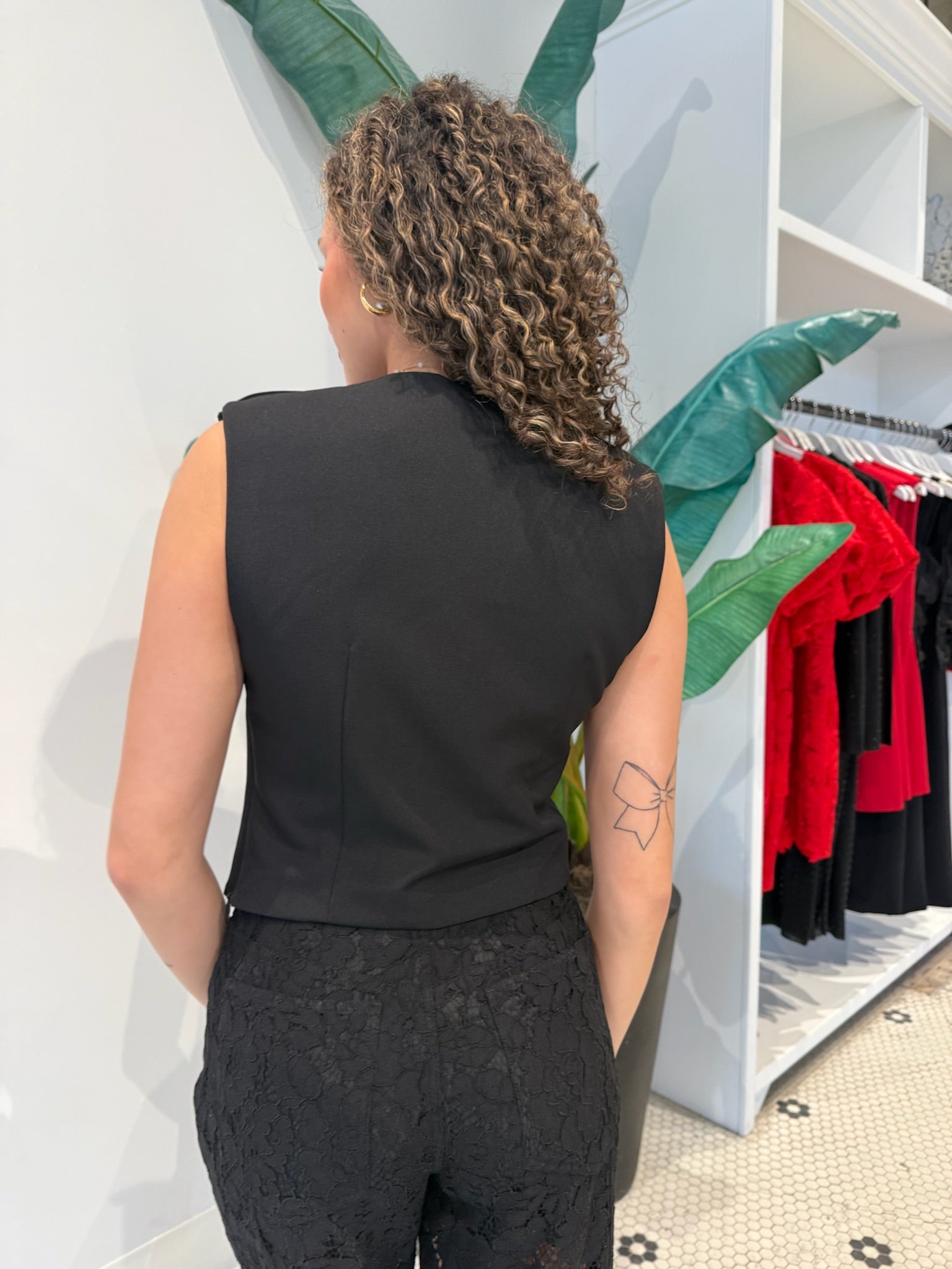 A little drama never hurt anyone. This sleek black crop top features a bold, oversized bow detail that makes a statement while keeping things chic. The sleeveless cut and tailored fit keep it modern and flattering, whether you’re dressing it up or keeping it edgy.