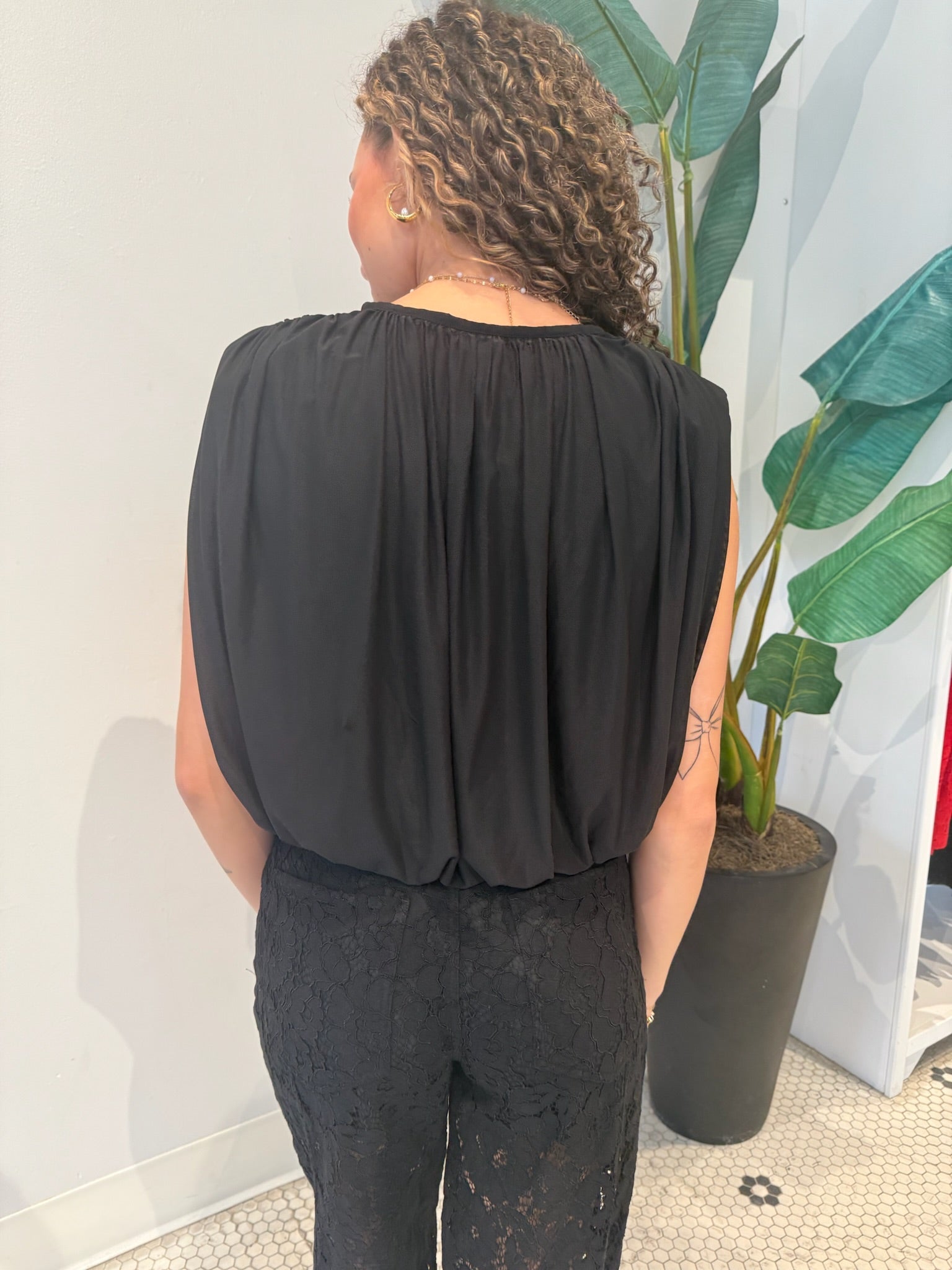 Effortless sophistication in one perfect top. The Cherra Top from Steve Madden features soft draping through the front and back for a relaxed yet elevated silhouette. The gathered neckline and blousy fit give it that chic, understated drama that transitions seamlessly from day to night. Lightweight and easy to style, this sleeveless black top pairs beautifully with everything from tailored trousers to denim.