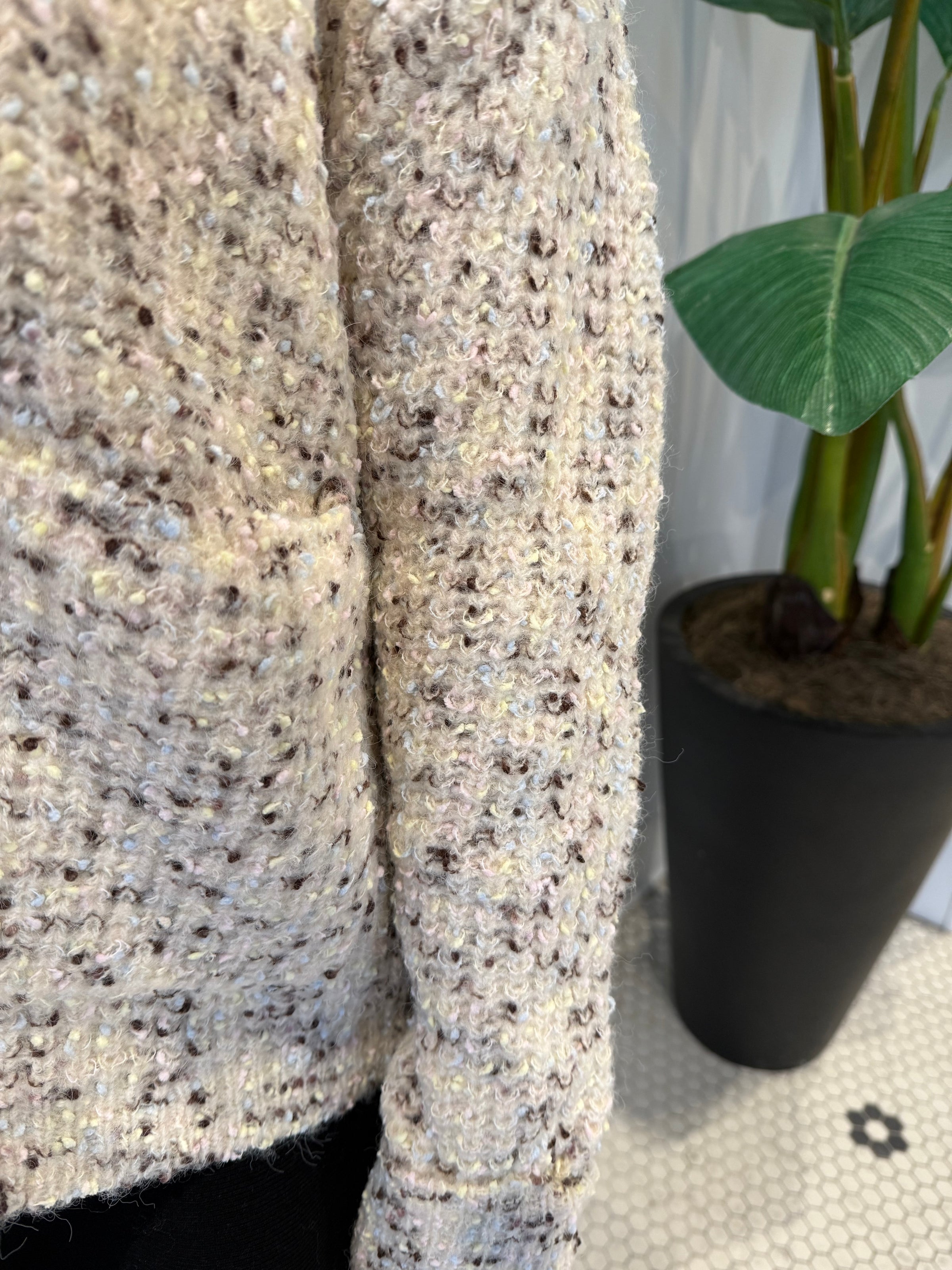 The Nedi V-Neck Cardigan is the definition of relaxed refinement. With its soft, speckled knit and easy silhouette, this piece brings texture and warmth to any outfit. The deep V-neckline and statement buttons add a modern polish, while the neutral cream hue keeps it endlessly versatile.