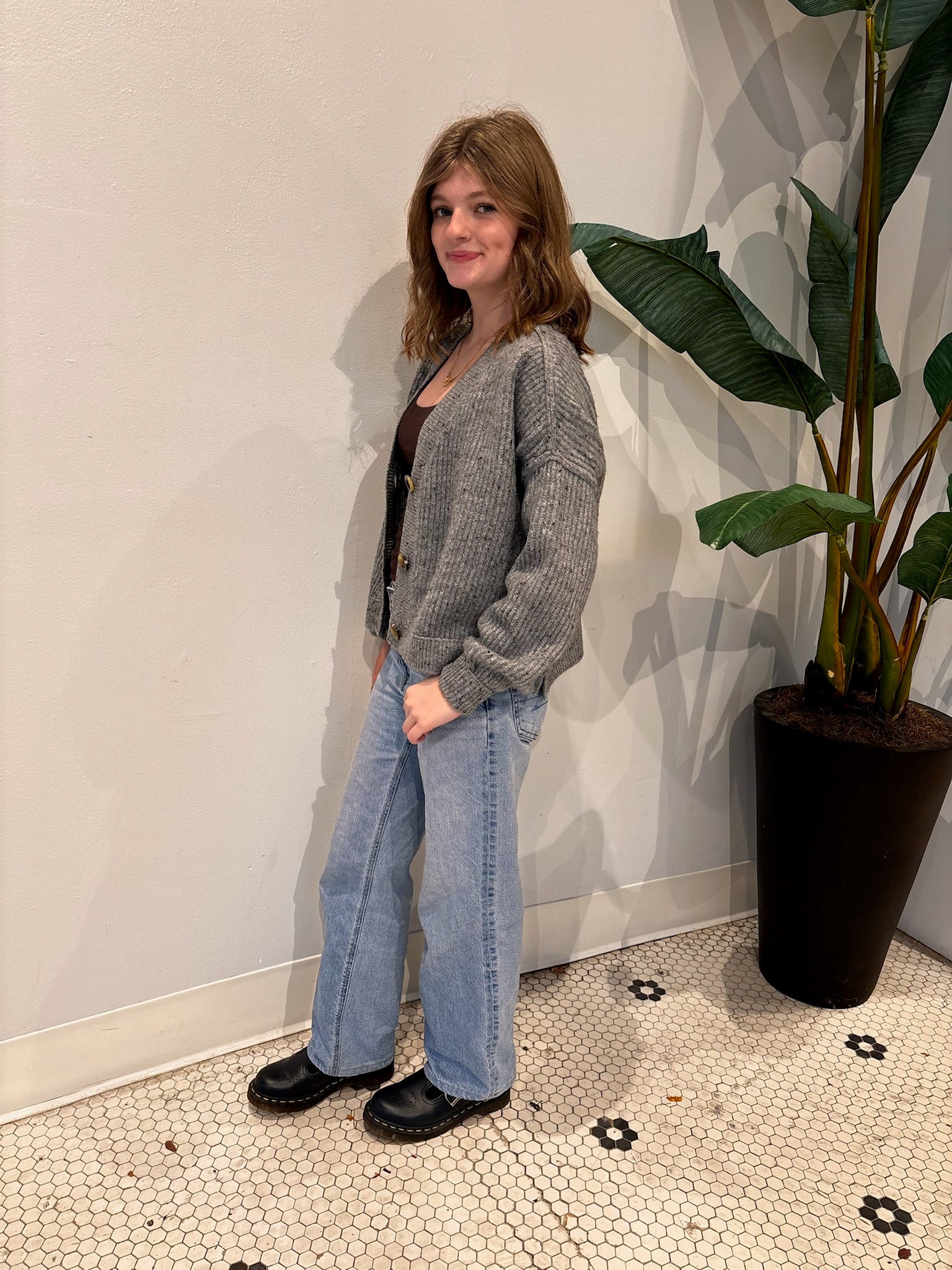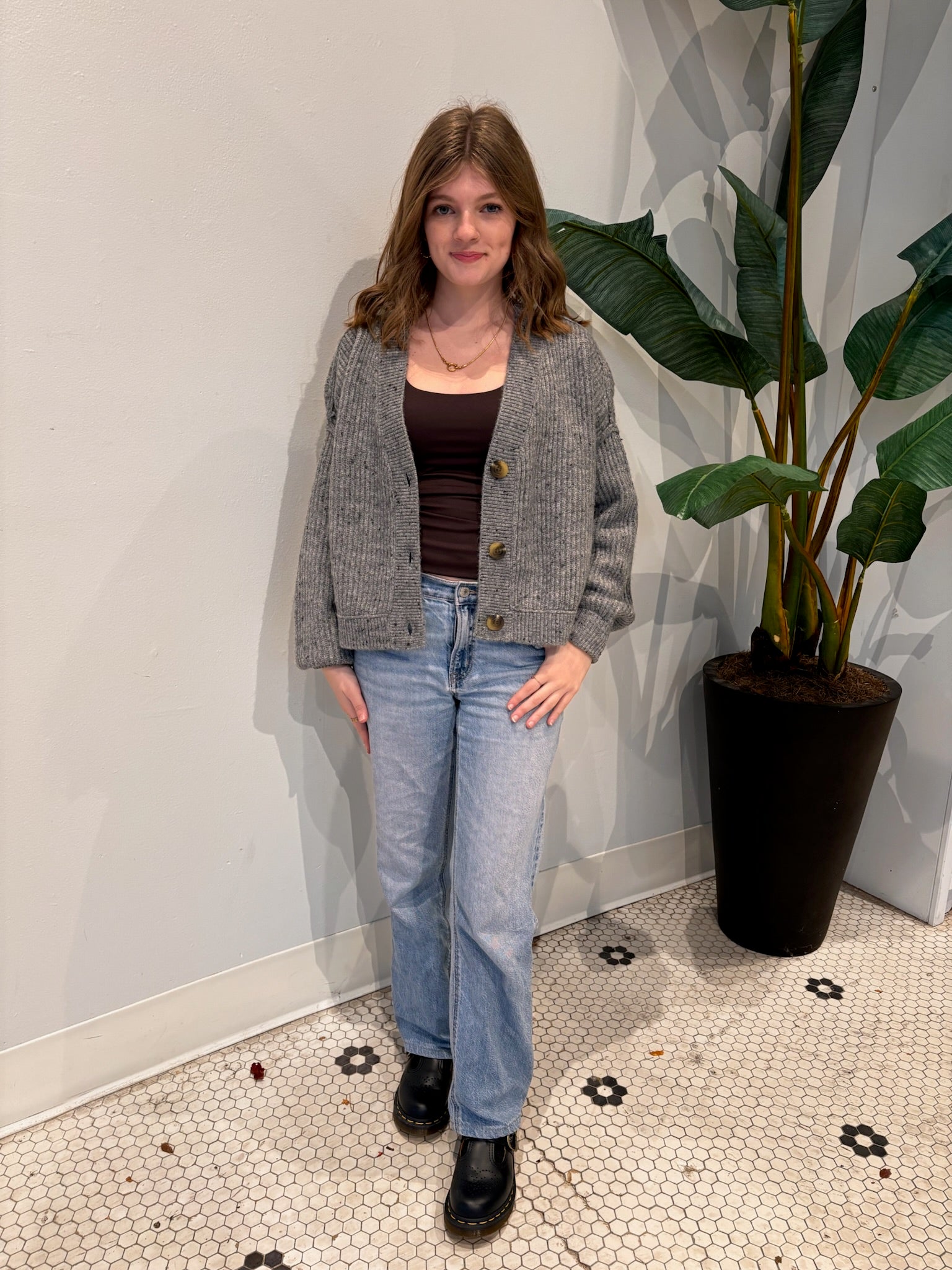 The Sumire V-Neck Cardigan blends timeless texture with modern ease. Designed with an intentionally relaxed fit, ribbed detailing, and statement buttons, it’s the layer that goes with everything—from tailored trousers to lounge sets. The dark grey hue adds a touch of urban edge while keeping it endlessly wearable.