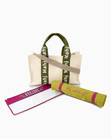 Olive Mahj It All Bag: This spacious bag is tailor-made to accommodate all your Mahjong essentials, including tiles, racks, the rack & roller bag, mat, and more. To ensure durability, it comes with a protective dust bag, keeping it in pristine condition. Inside, you'll find two pouches and a zippered pocket for added organization. For convenience and style, we've included a chic crossbody strap, allowing you to effortlessly carry your Mahj-It-All Bag whether you're heading to a gaming session or a busy day at work. Dimensions: 22"W x 15"H x 6"D